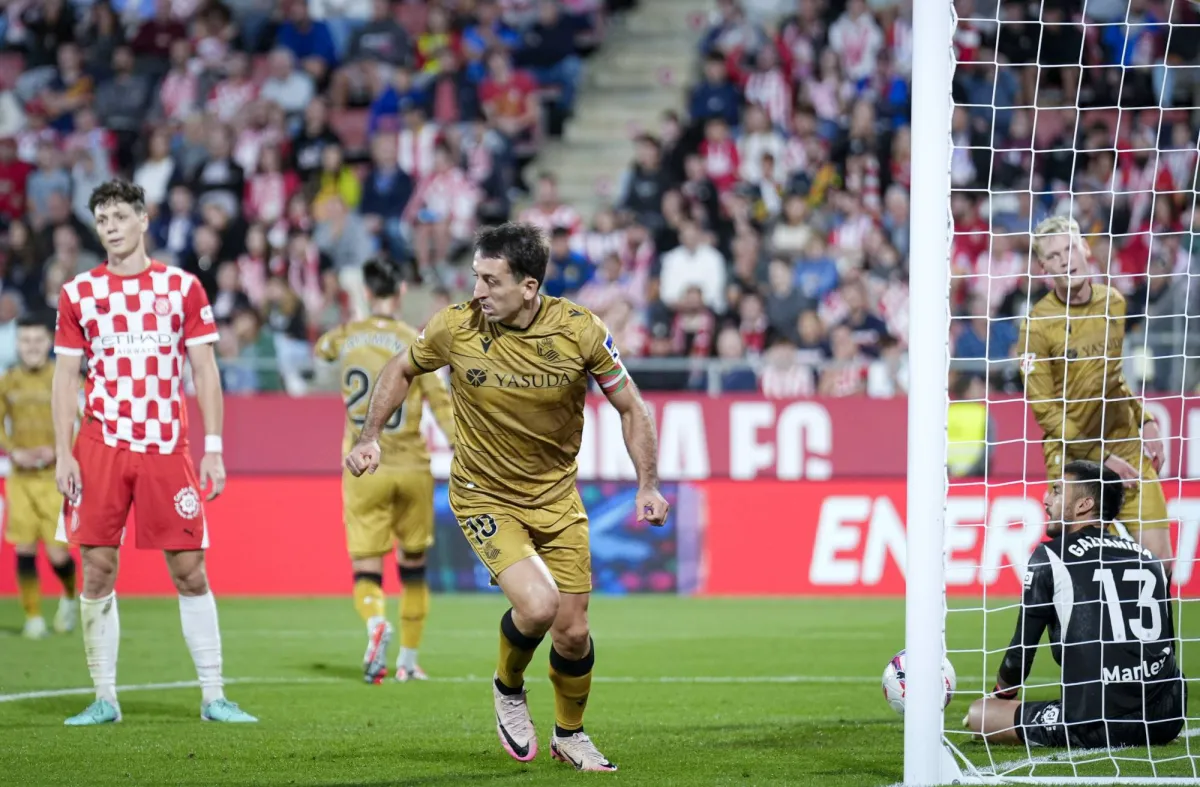 فرحة أويارزابال قائد ريال سوسيداد بهدف الفوز في مرمى جيرونا بالدوري الإسباني (إ.ب.أ)