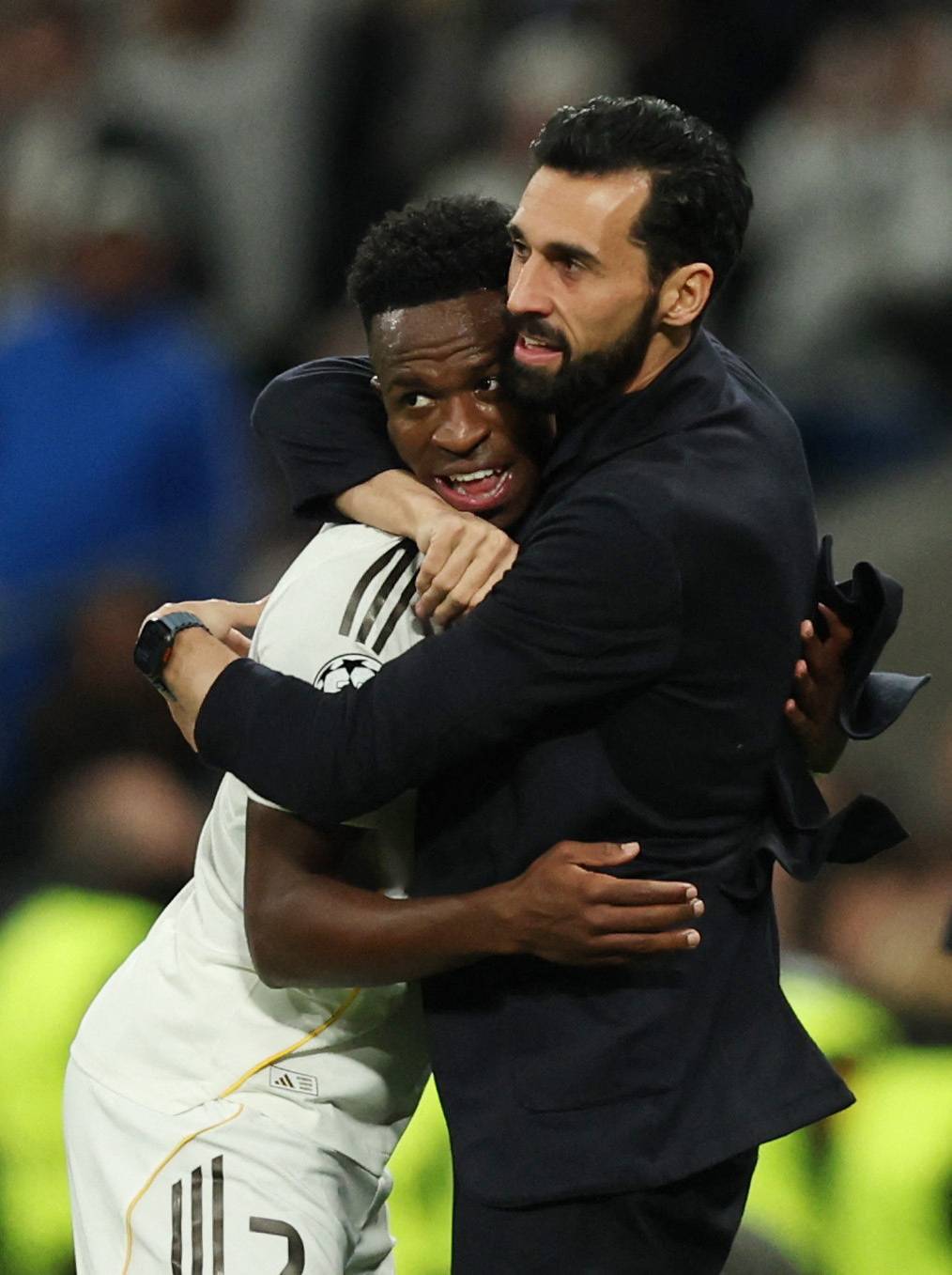 فينيسيوس ومدربه أربيلوا وفرحة اكتساح موناكو في دوري الأبطال (رويترز)
