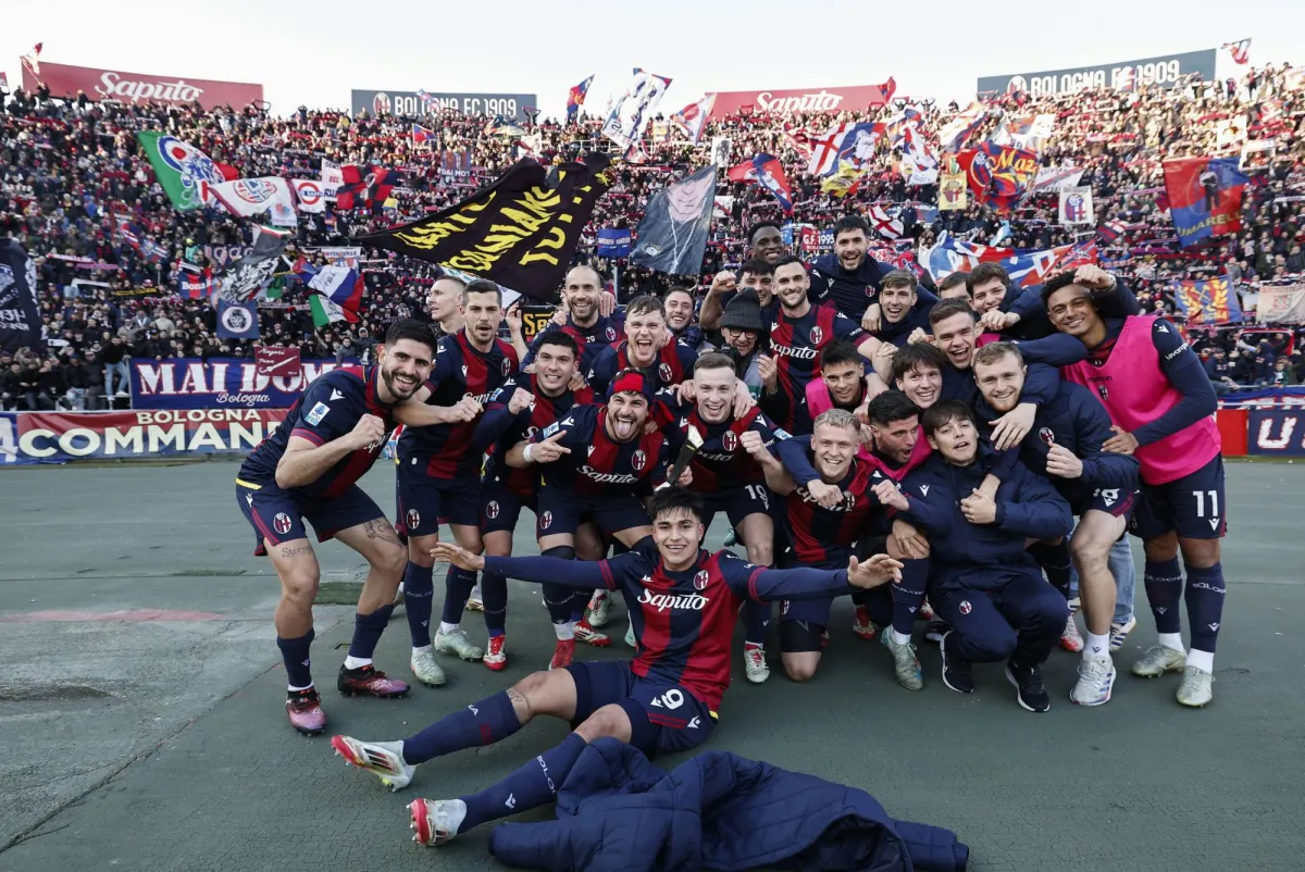 فرحة لاعبي بولونيا وسط جماهيرهم بعد الفوز على كالياري (إ.ب.أ)