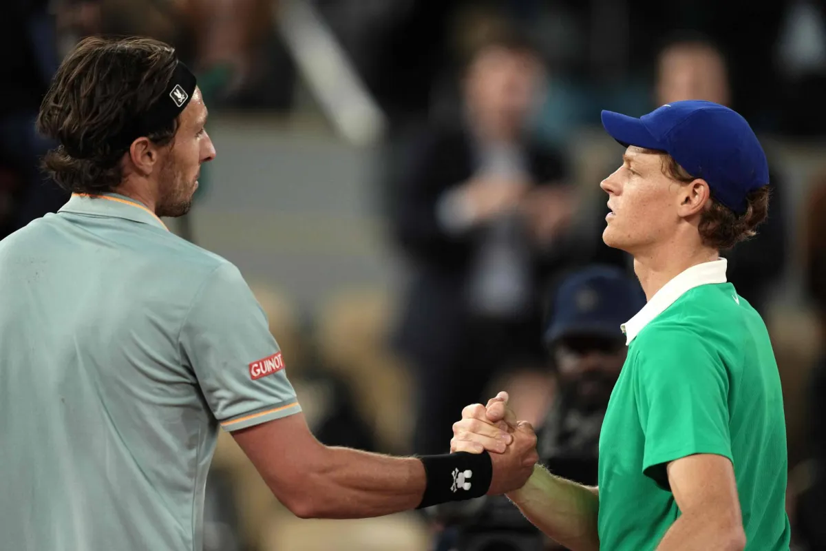 وفي ثاني مشاركة له منذ العودة من إيقاف لثلاثة أشهر بسبب قضية المنشطات، بعد أولى في دورة روما لماسترز الألف نقطة حين وصل إلى النهائي وخسر أمام ألكاراس، بدأ سينر مشواره نحو لقب أول في رولان غاروس ورابع في البطولات الكبرى بشكل جيد رغم التعثر في المجموعة الثالثة وتغلب على الفرنسي أرتور ريندركنيش المصنف 75 عالميا 6-4 و6-3 و7-5.