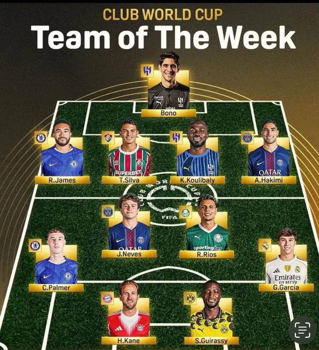 وجاءت التشكيلة المثالية كما يلي: بونو؛ ريس جيمس، تياغو سيلفا، كوليبالي، حكيمي؛ ريتشارد ريوس، جواو نيفيز، كول بالمر؛ غونزالو غارسيا، هاري كين، غيراسي. ووفقاً للـ«فيفا»، فإن جميع اللاعبين الـ11 سيكونون متاحين للمشاركة في مباريات ربع النهائي، التي ستُقام يومي الجمعة والسبت، 4 و5 يوليو (تموز).