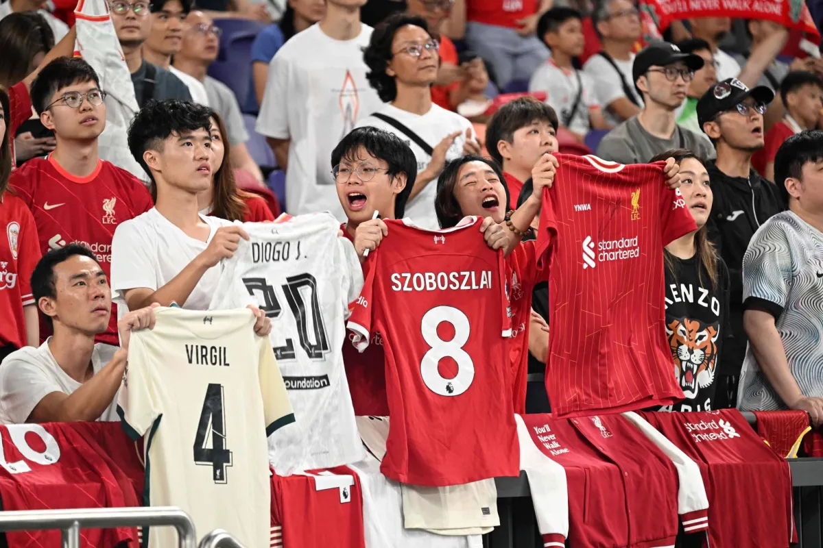 مشجعو ليفربول خلال حصة تدريبية للفريق في ملعب كاي تاك في هونغ كونغ (أ.ف.ب)