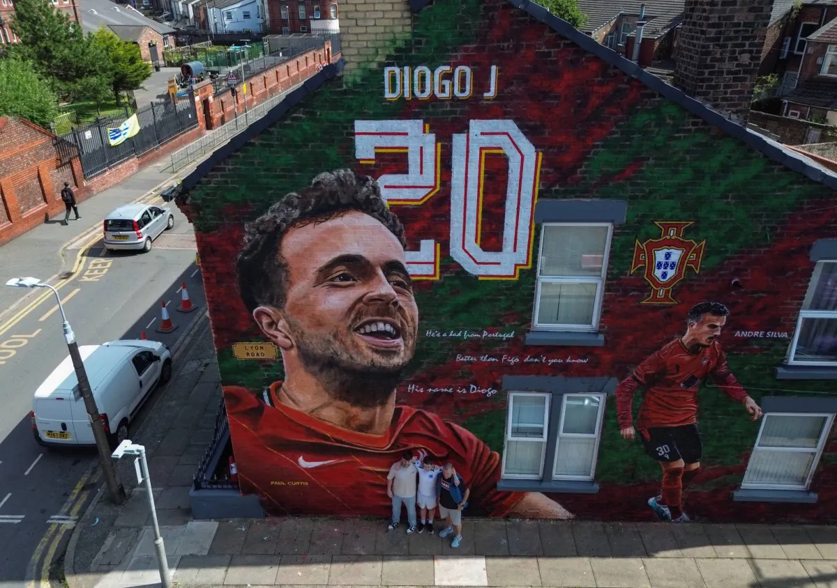 وُضعت آلاف الزهور والأوشحة واللافتات وغيرها من التذكارات خارج ملعب أنفيلد منذ وفاة جوتا وشقيقه أندريه سيلفا.