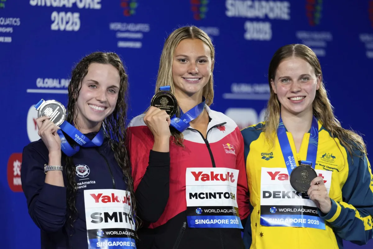 فازت الكندية سامر ماكنتوش بذهبيتها الثالثة في بطولة العالم للألعاب المائية في سنغافورة، عندما أحرزت المركز الأول في سباق 200 متر فراشة في منافسات السباحة، الخميس، واقتربت من تحطيم رقم قياسي عالمي جديد.