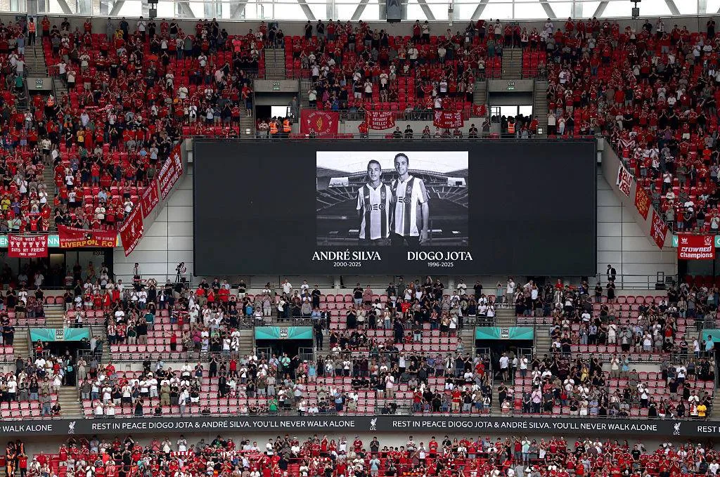 حظي البرتغالي الراحل ديوغو جوتا وشقيقه أندريه سيلفا بتكريم مؤثر في ملعب «ويمبلي» بالعاصمة البريطانية لندن، قبل مباراة الدرع الخيرية لكرة القدم بين ليفربول وكريستال بالاس، الأحد.