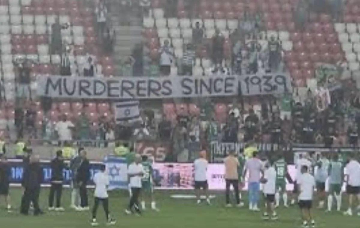 عرض مشجعو نادي مكابي حيفا الإسرائيلي لافتة «قتلة منذ عام 1939» (وسائل إعلام بولندية)