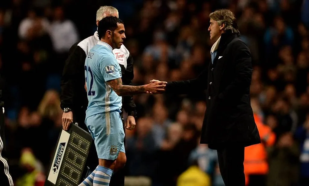 لم تكن العلاقة بين مانشيني وتيفيز في مانشستر سيتي وثيقة وكانت تزداد سوءاً (غيتي)