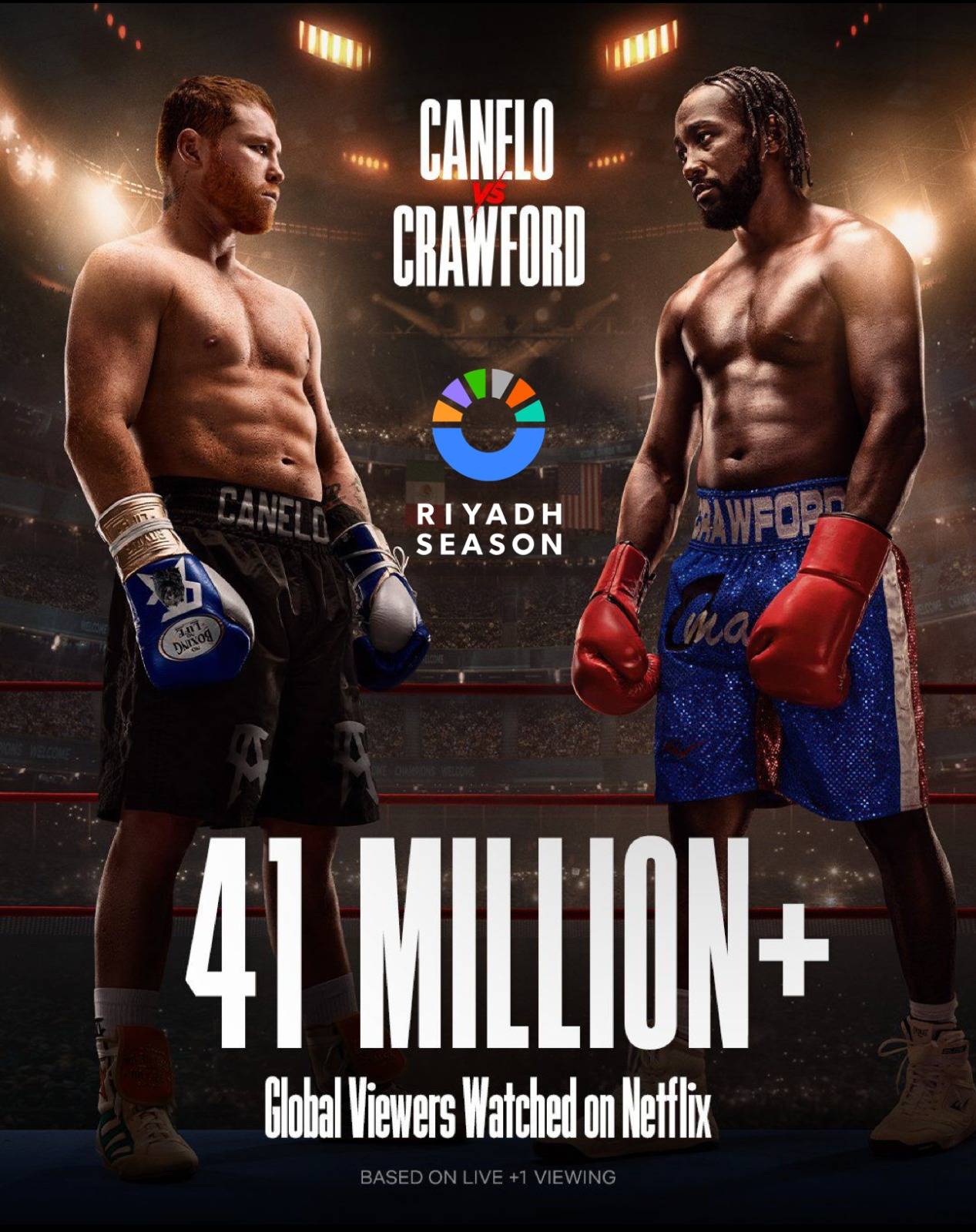 أعلنت منصة «نتفليكس» أن نزال ساؤول «كانيلو» ألفاريز وتيرينس كروفورد، الذي أقيم مساء السبت الماضي، ضمن فعاليات موسم الرياض 2025، جذب أكثر من 41 مليون مشاهد عالمي، ليصبح بذلك أكثر نزالات الملاكمة مشاهدة في هذا القرن.
