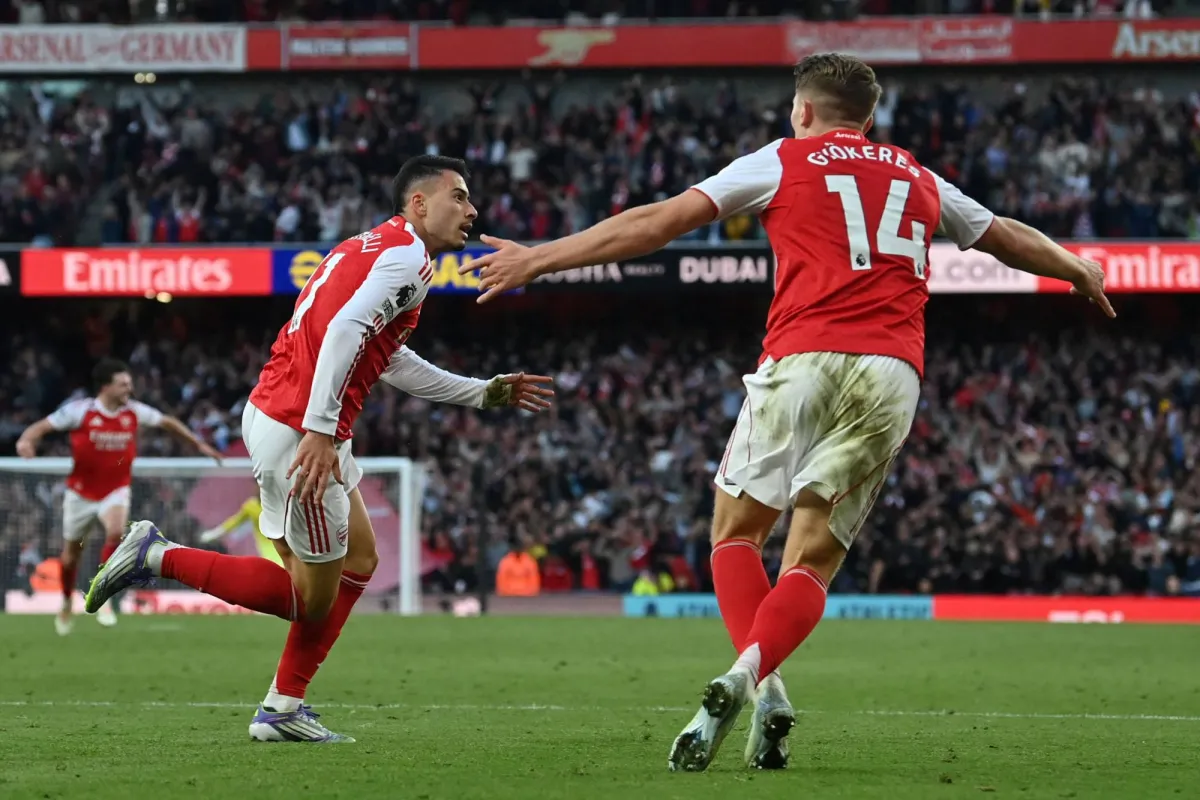 البرازيلي غابرييل مارتينيلي يحتفل بهدف التعادل لآرسنال (أ.ف.ب)