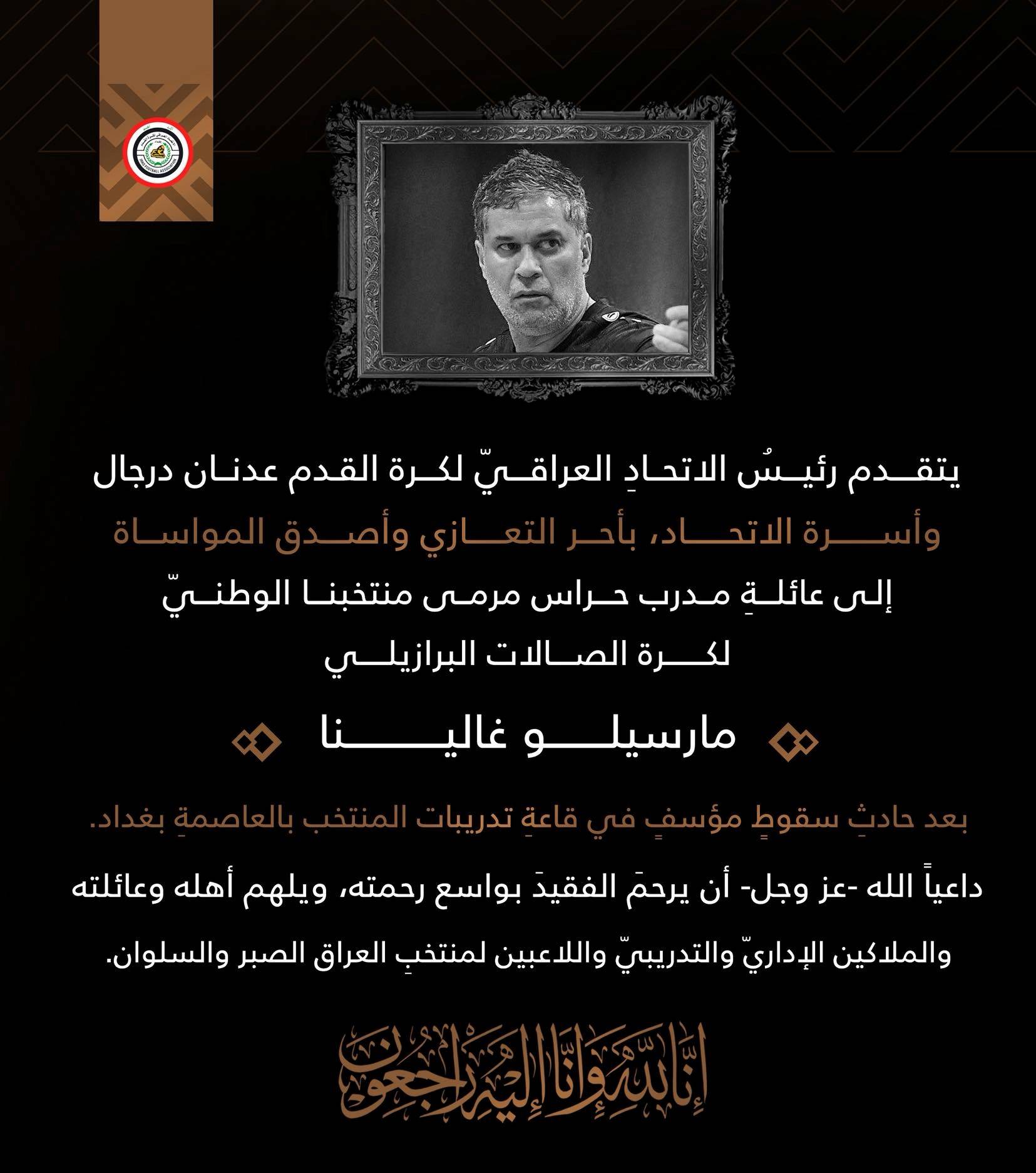 وقال درجال في بيان رسمي لاتحاد الكرة العراقي اليوم الاثنين: «نتقدم بأحر التعازي والمواساة لعائلة الفقيد مدرب الحراس البرازيلي مارسيلو، الذي كان مثالاً للالتزام والحرص في عمله، وقد ترك بصمة واضحة في مسيرة المنتخب».