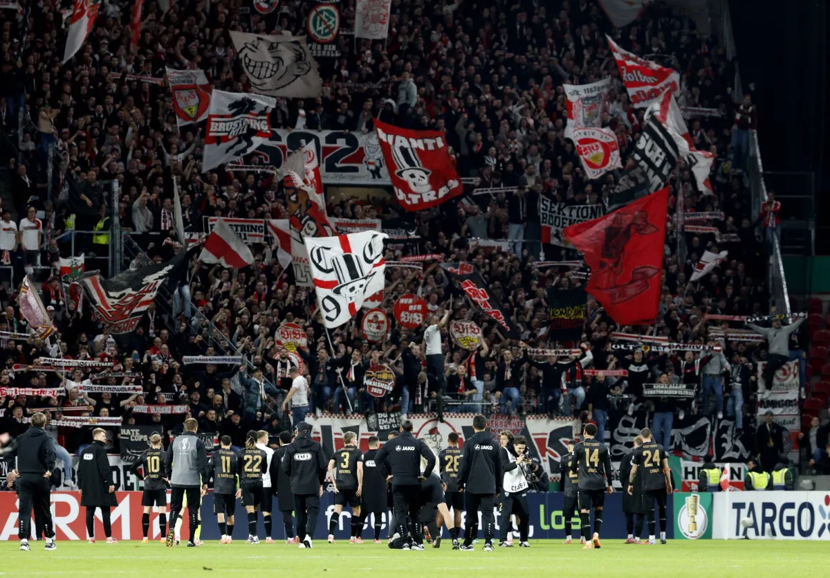 لاعبو شتوتغارت يحتفلون مع جماهيرهم بعد الفوز (رويترز)