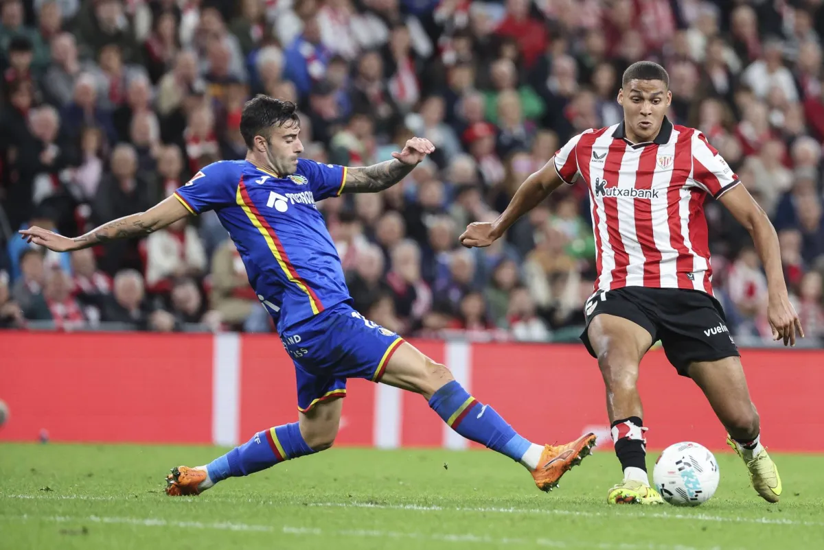 مروان سنّادي لاعب أتلتيك بلباو في مواجهة دييغو ريكو (يسار) لاعب خيتافي خلال مباراة كرة القدم ضمن الدوري الإسباني (الليغا) بين أتلتيك بلباو وخيتافي (إ.ب.أ)