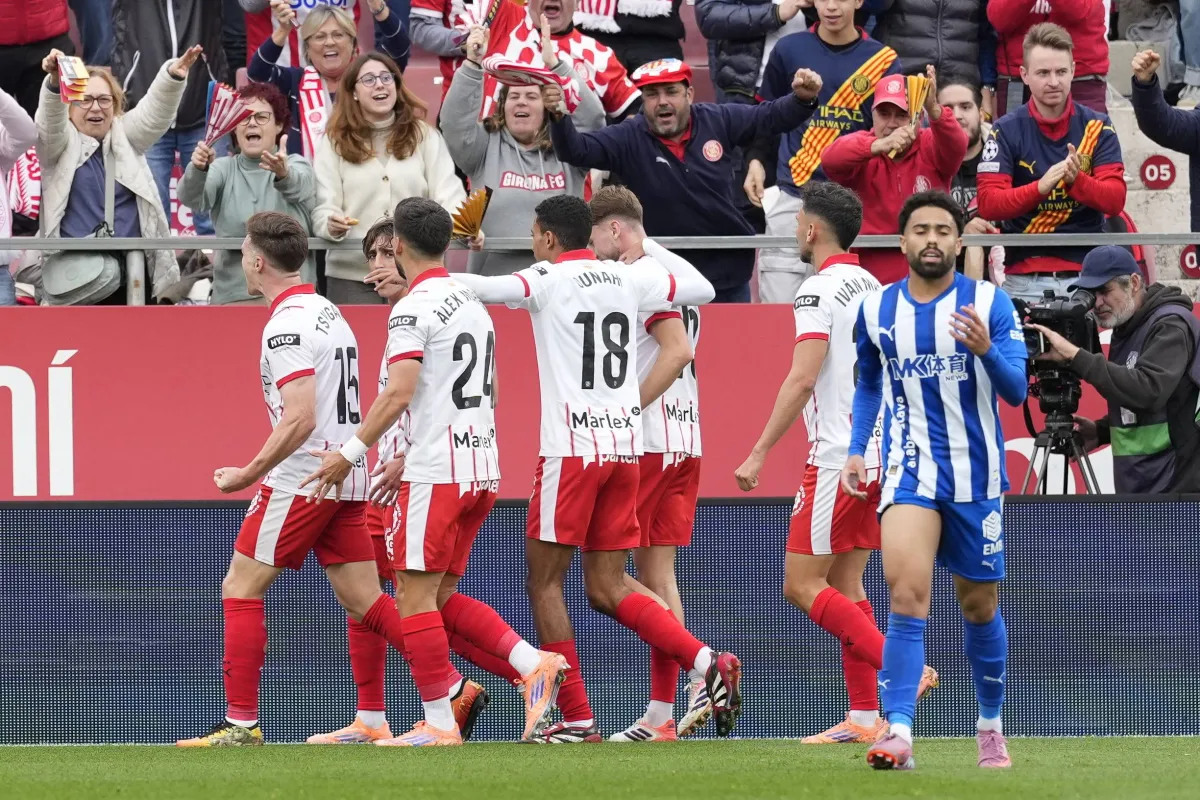 فرحة لاعبي جيرونا بهدف الفوز على ألافيس (إ.ب.أ)