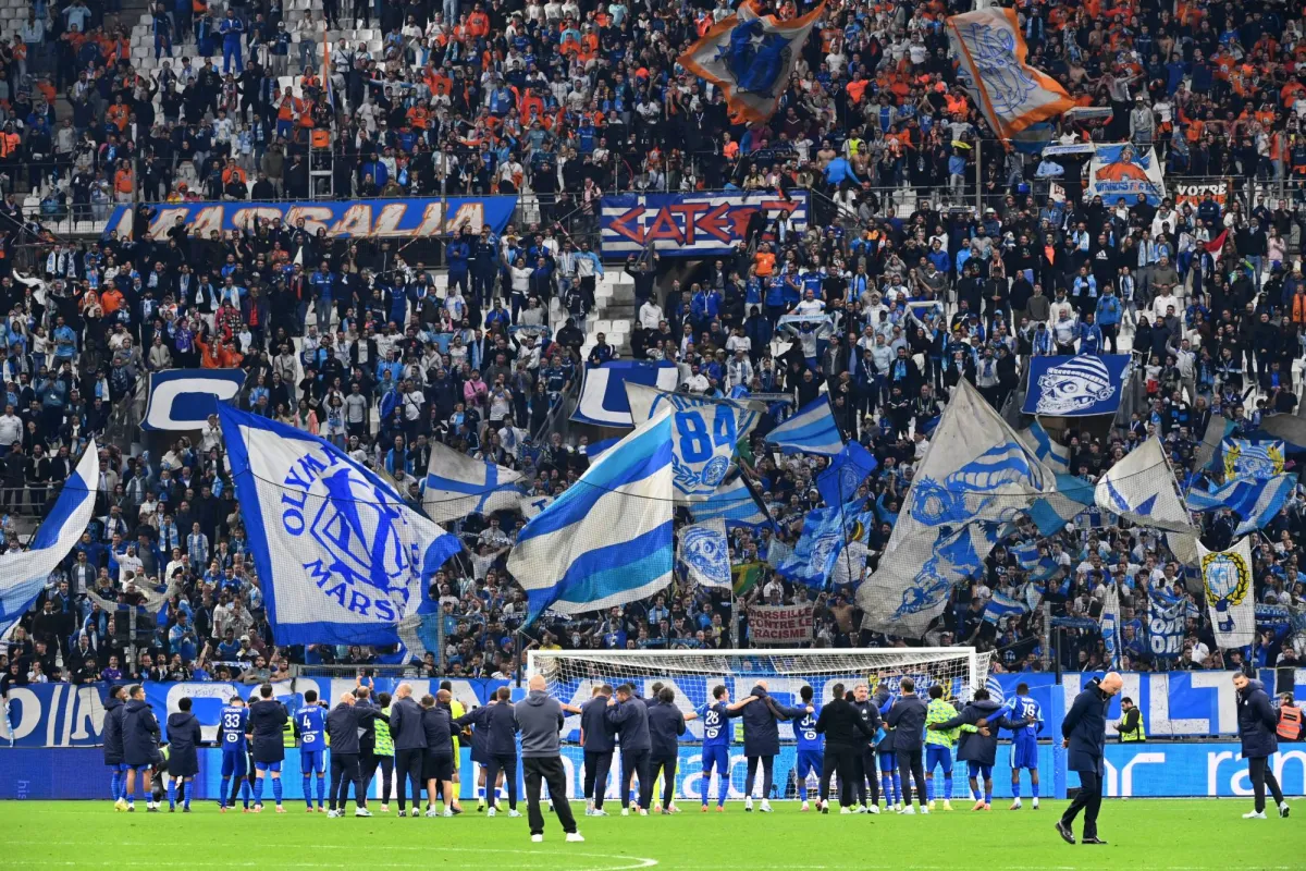 احتفالية لاعبي مرسيليا مع جماهيرهم بالفوز على بريست (رويترز)