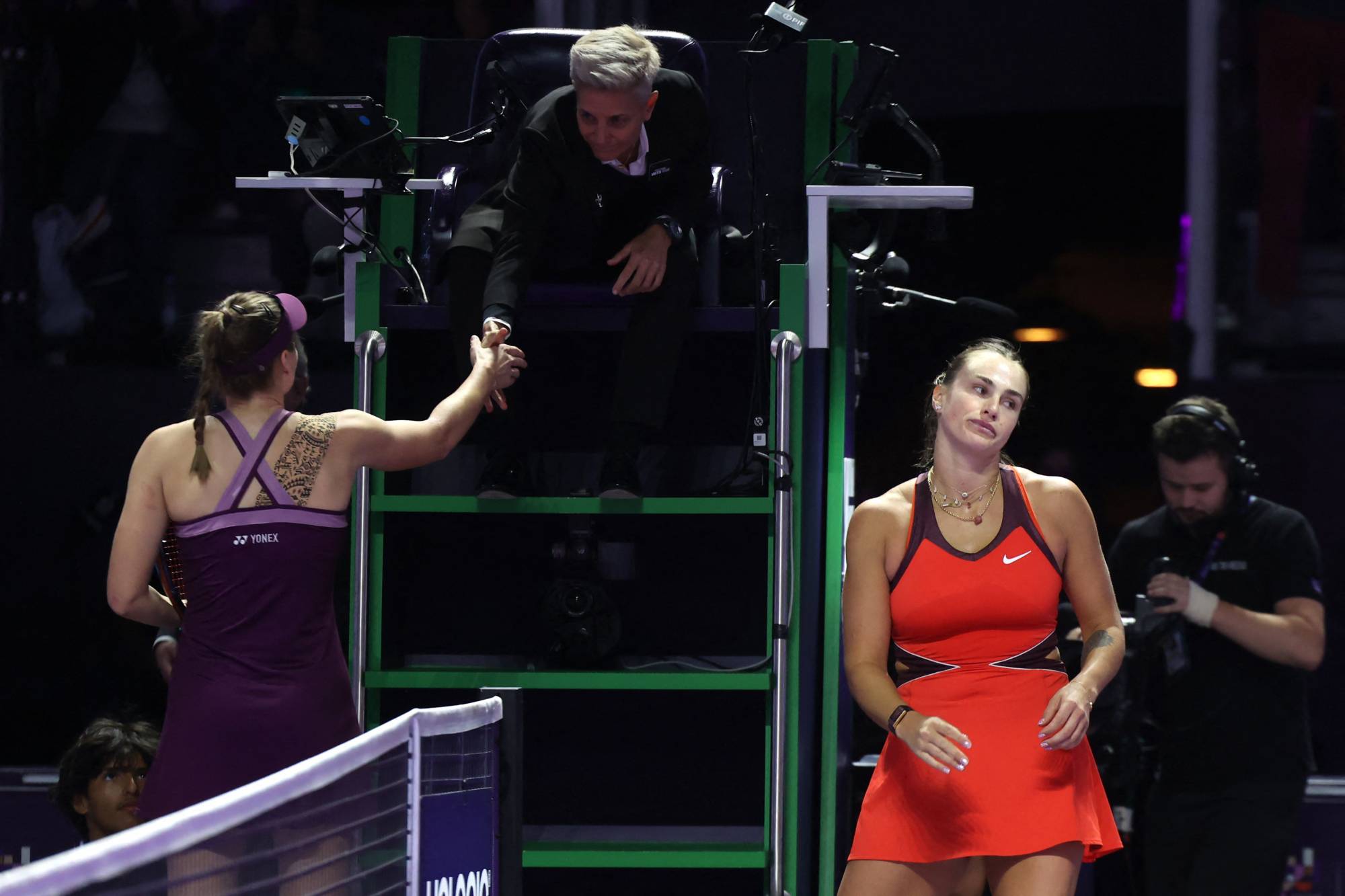 ريباكينا تصافح الحكم بعد فوزها على سابالينكا التي يبدو عليها الإحباط (أ.ف.ب)