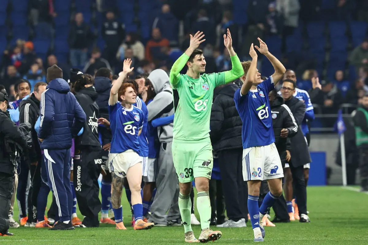 لاعبو ستراسبورغ يحيون جماهيرهم بعد الفوز على ليل (أ.ف.ب)
