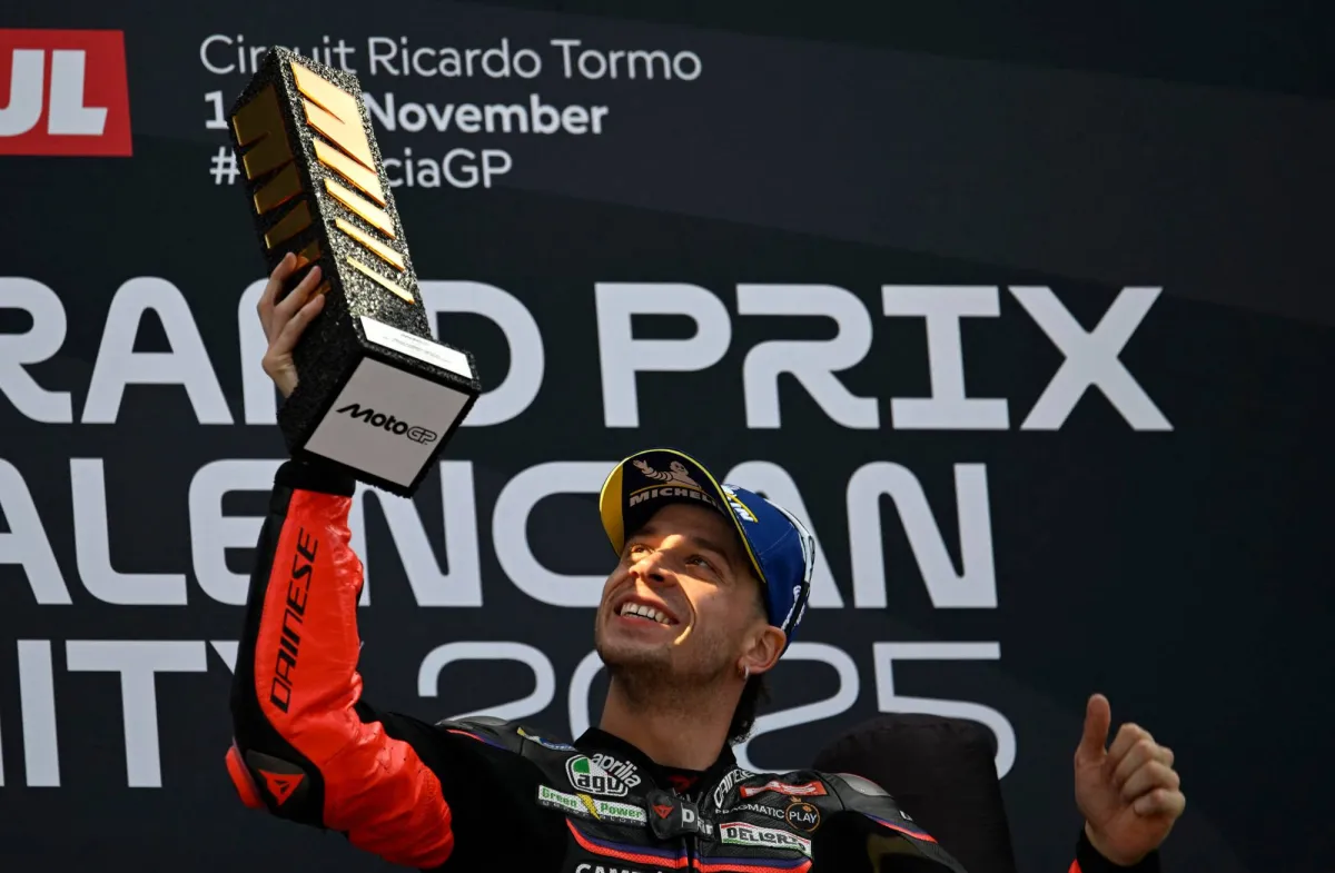 وكان بتسيكي قد حقق فوزاً مهيمناً من الانطلاق حتى النهاية في جائزة البرتغال الكبرى، الأسبوع الماضي، وكرر الإيطالي إنجازه في فالنسيا، محتفلاً بالركوع على ركبة واحدة كأنه يقدم عرضاً للزواج من دراجته النارية المحبوبة.