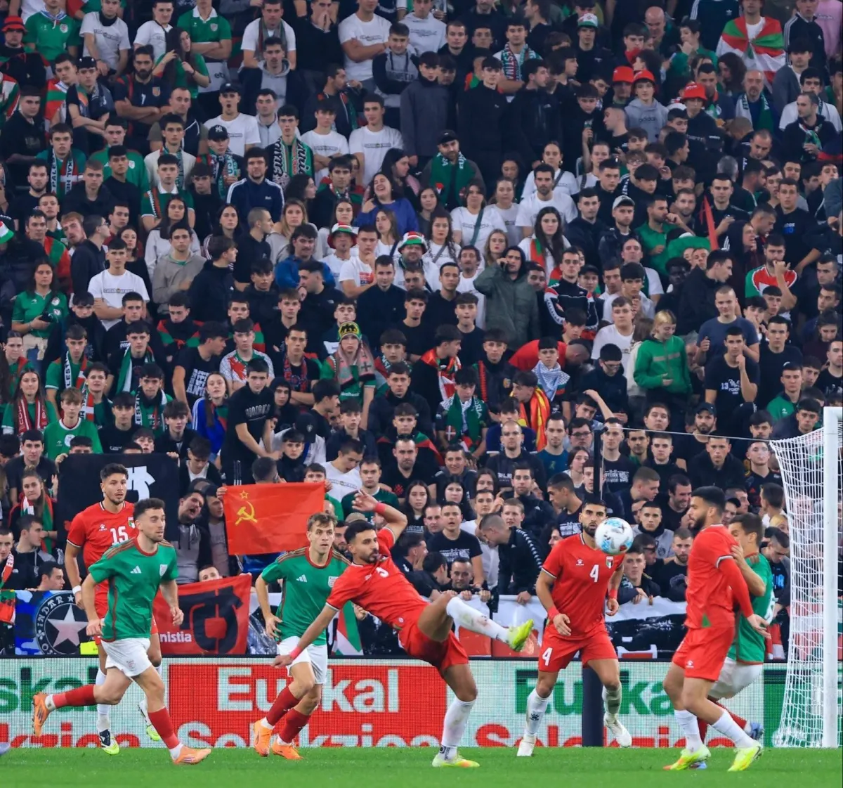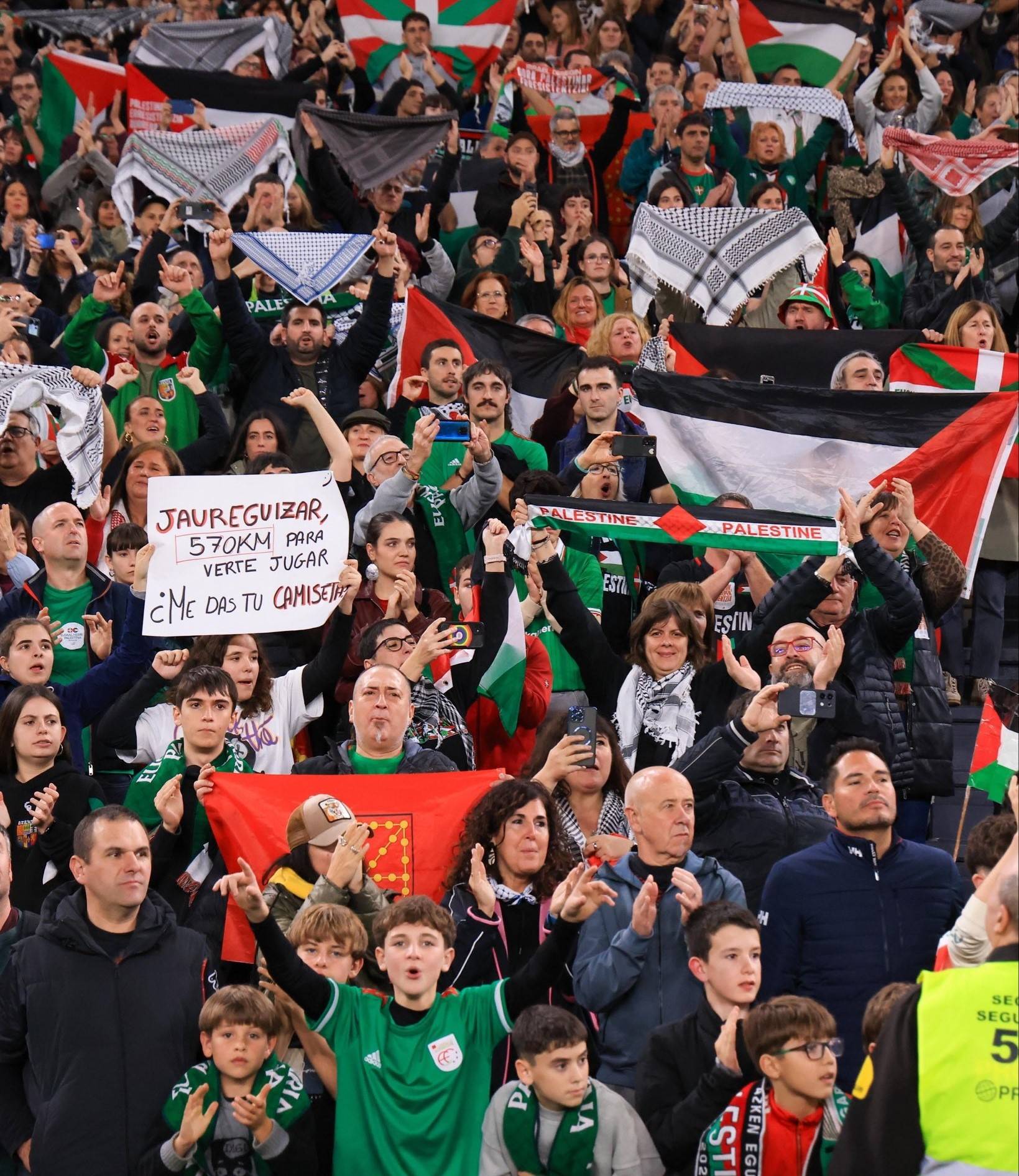 وحين وصل موكب منتخب فلسطين إلى محيط الملعب، فُتح له ممر بشري امتد حتى البوابات، بينما كانت الأعلام الفلسطينية والباسكية تتداخل في كل زاوية.
