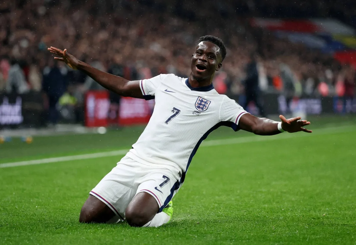 ساكا محتفلاً بأحد أهدافه مع إنجلترا في التصفيات المونديالية الأخيرة (رويترز)