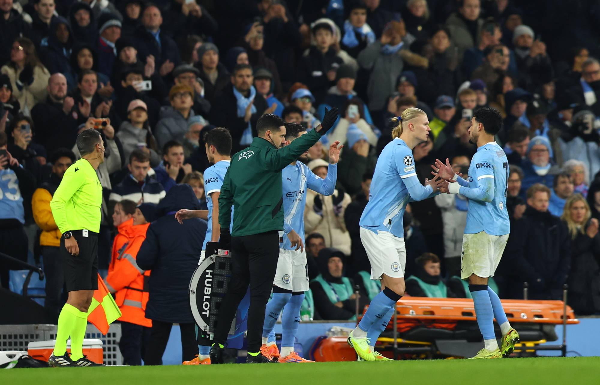 وفي الممر المؤدي إلى أرضية الملعب، فيما كان اللاعبون ينتظرون دخول منافسهم الشوط الثاني، التفّت مجموعة منهم حول غوارديولا الذي بدأ يحرّك يديه بشغف، يطلق التعليمات التكتيكية موجة بعد أخرى. منح فيل فودن، ونيكو أوريلي، وجيريمي دوكو جرعة مكثفة من الرسائل الحماسية، فيما كان ريكو لويس وأوسكار بوب وريان آيت نوري يخرجون ضحايا لهذا التعديل السريع.