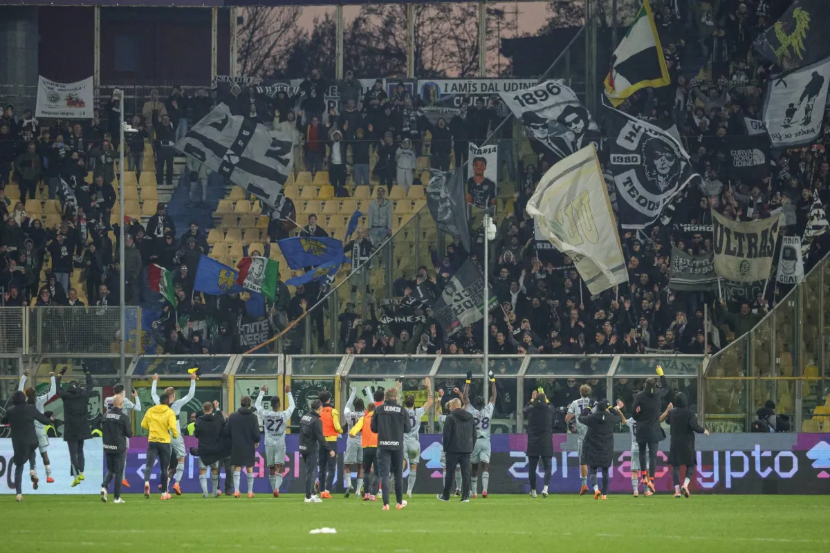 لاعبو أودينيزي يحيون جماهيرهم الزائرة بعد الفوز على بارما (إ.ب.أ)