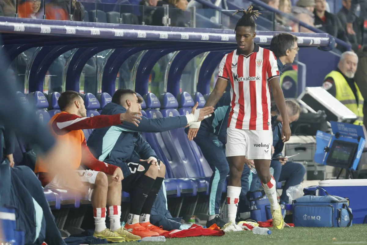 نيكو ويليامز نجم أتلتيك بلباو يصافح زملاءه بعد تغييره في مواجهة ليفانتي (إ.ب.أ)