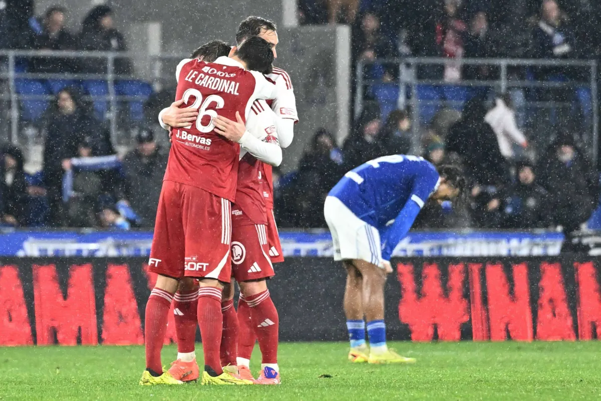 فرحة لاعبي بريست بالفوز على ستراسبورغ (أ.ف.ب)