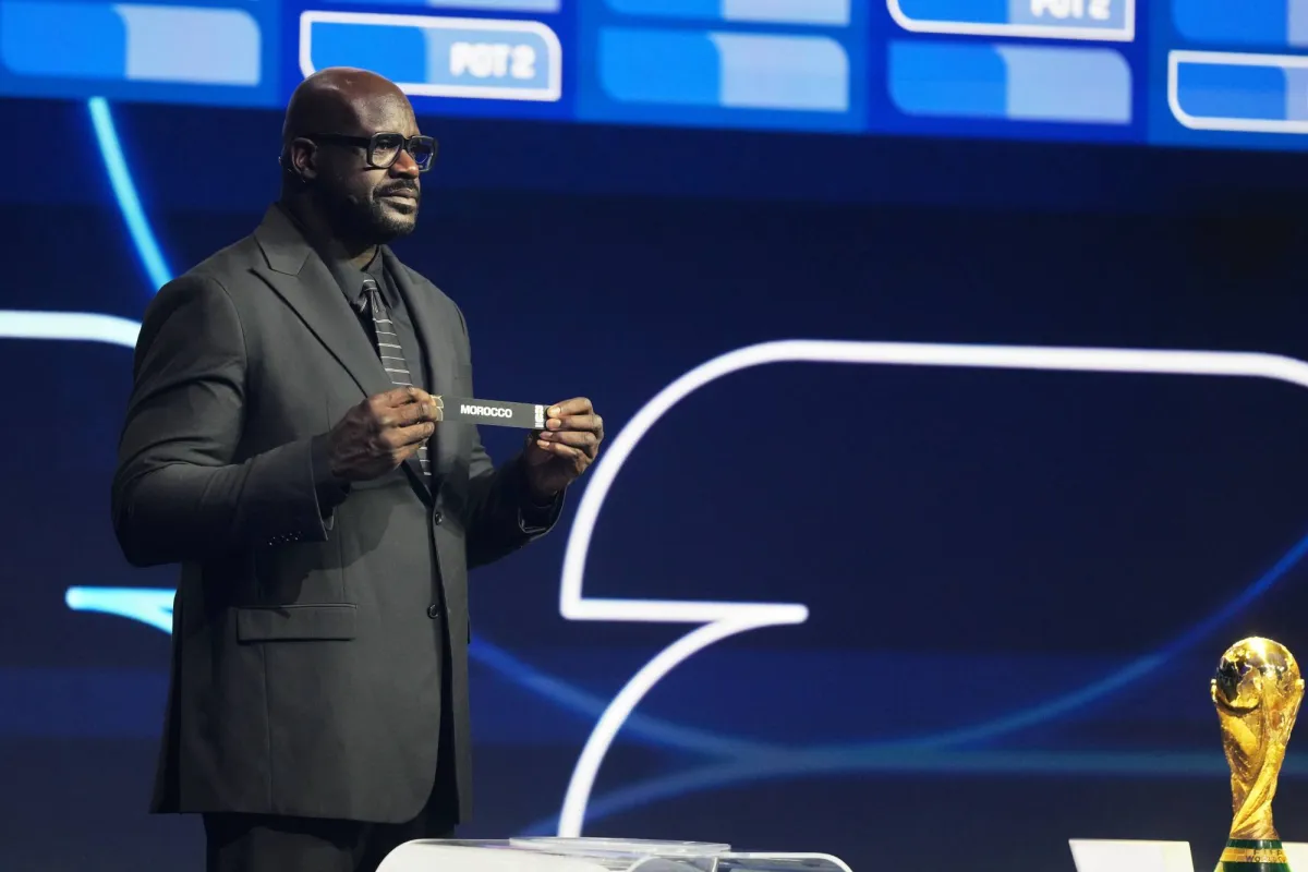 أونيل نجم السلة المعتزل لحظة عرضه بطاقة المغرب خلال مراسم القرعة (أ.ب)