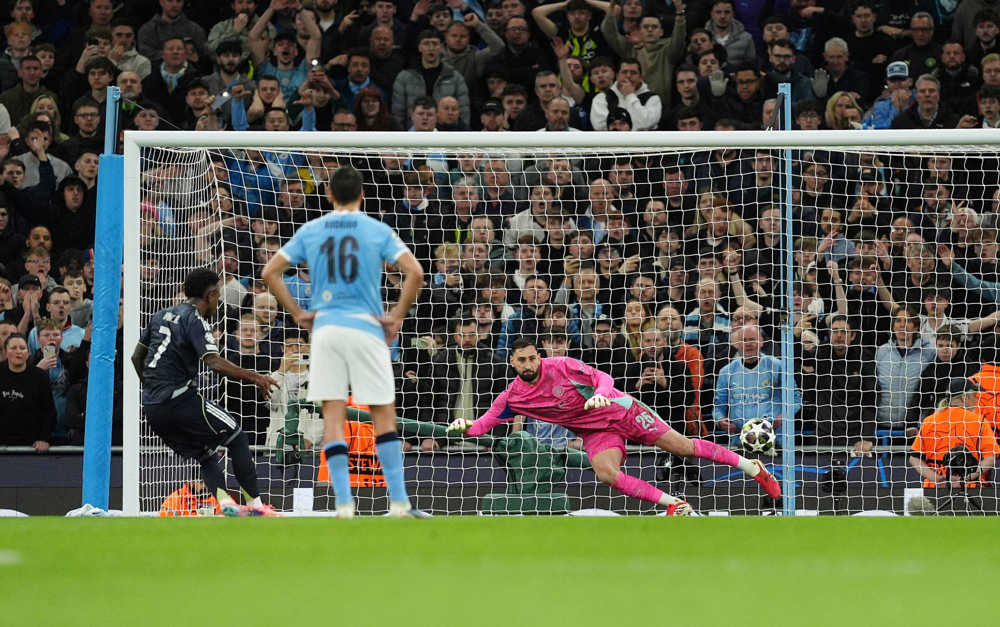 فينيسيوس نجم الريال (يسار) يسجل هدفه الأول من ركلة جزاء في مرمى سيتي (د ب ا)