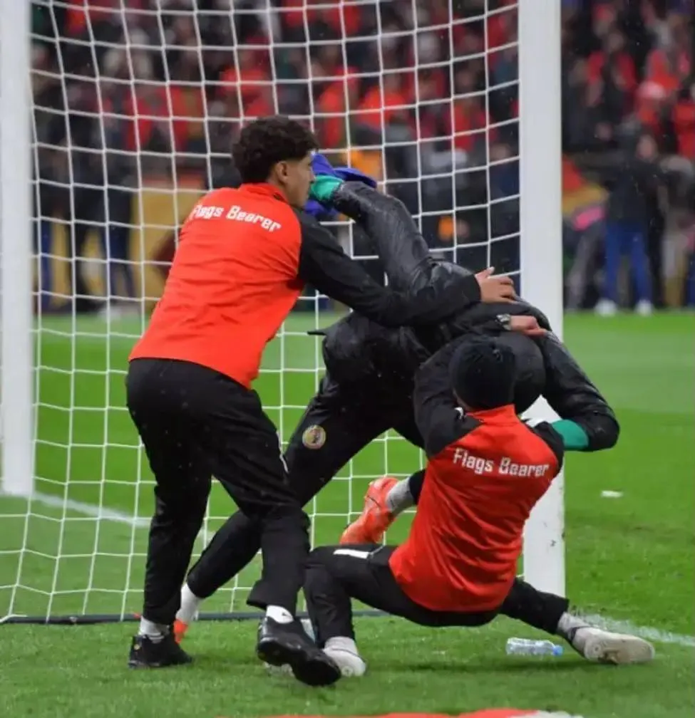 ومع تفاقم المشهد، تدخَّل الحارس السنغالي الاحتياطي يهفان ديوف، لاعب نيس الفرنسي، الذي تمركز خلف مرمى ميندي وتولى بنفسه مسؤولية حماية المنشفة، رافضاً تركها بعيداً عن ناظريه. لكن ما تلا ذلك كان أكثر غرابة، إذ حاول جامعو الكرات انتزاع المنشفة من يديه، مما أدى إلى إسقاطه أرضاً وسحبه على العشب، في وقت كانت فيه المباراة مستمرة، بينما نهائي قاري يُلعب وخلف المرمى صراع شدّ وجذب يجري بشكل علني.
