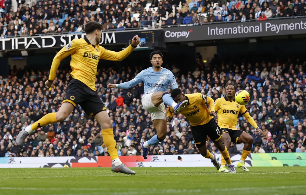 تسديدة مرموش لاعب مانشستر سيتي في طريقها لتعانق شباك وولفرهامبتون (رويترز)