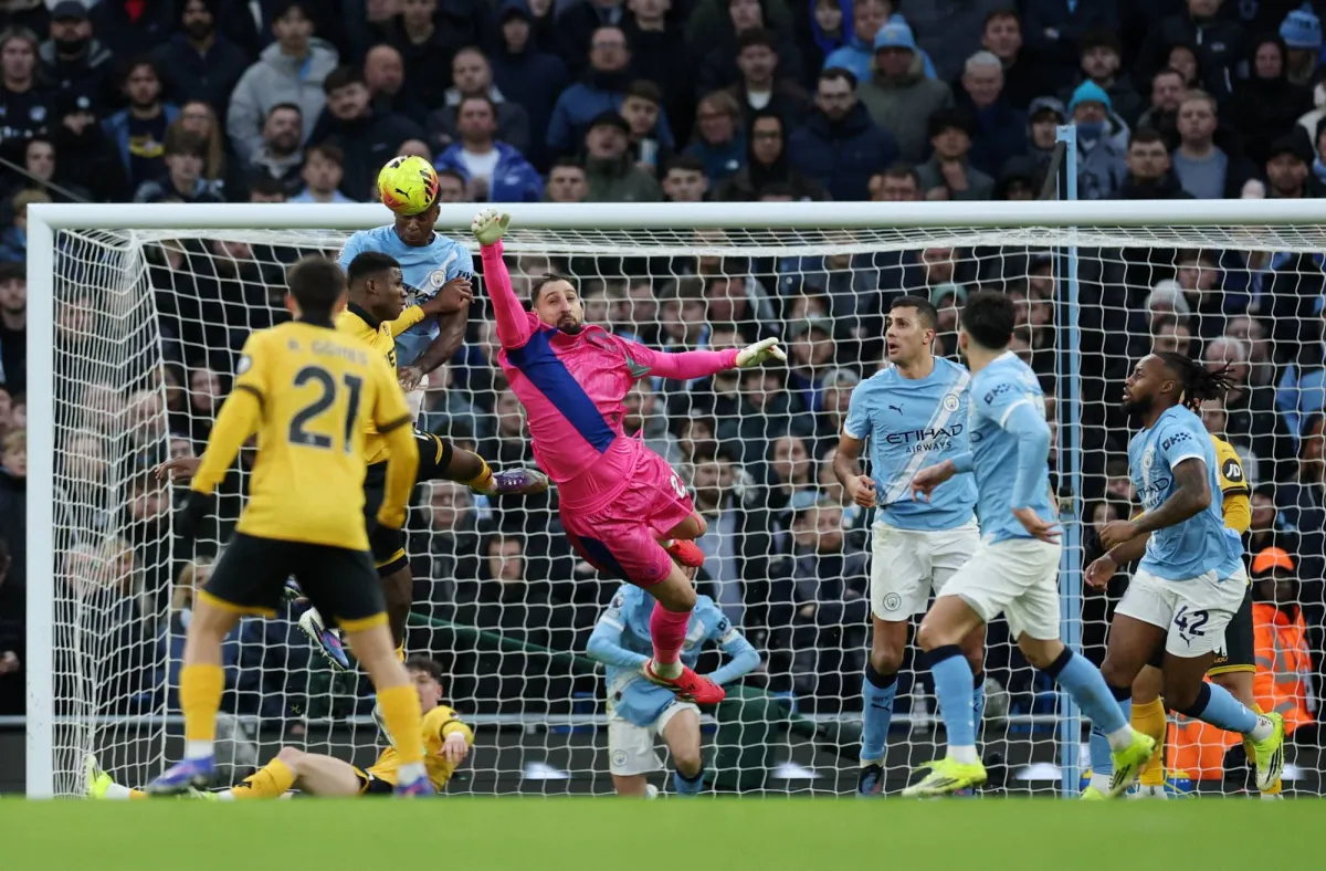 غويهي (يسار) يتصدي برأسه لتسديدة من أحد لاعبي وولفرهامبتون (رويترز)