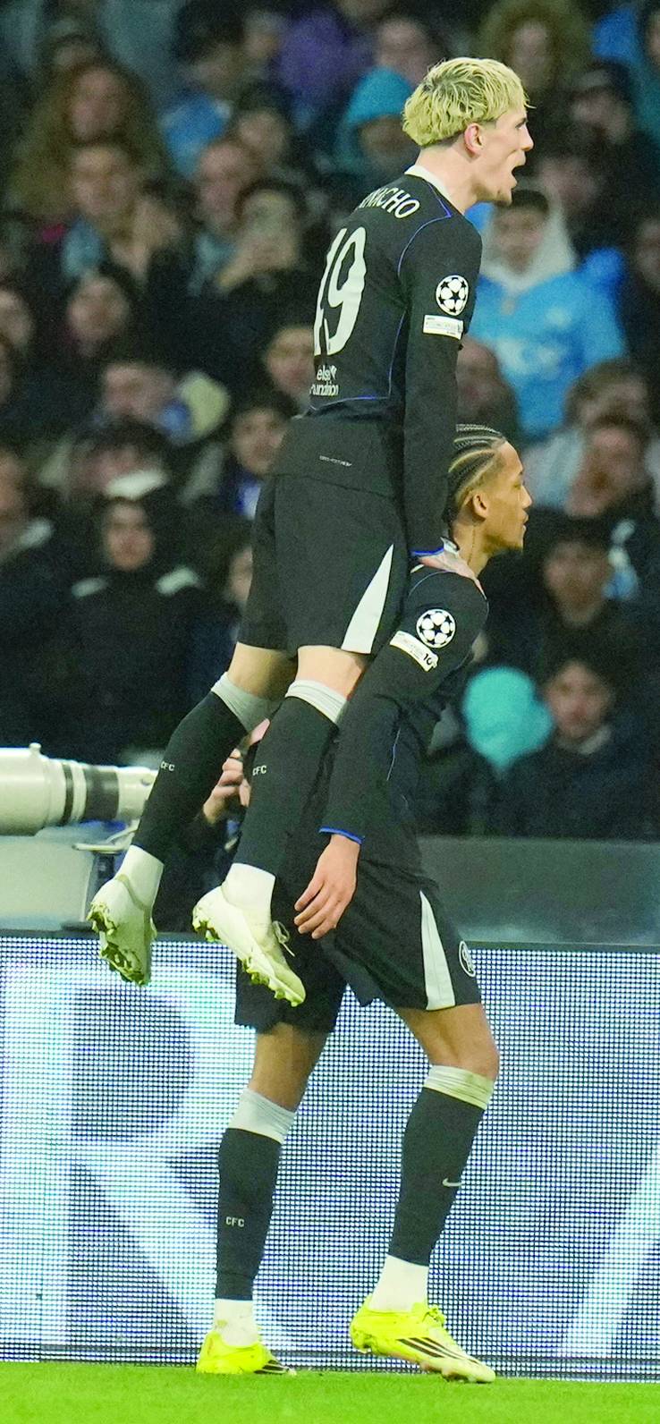 بيدرو يحتفل بصحبة غارناتشو وفرحة هدف فوز تشيلسي على نابولي (أ.ب)