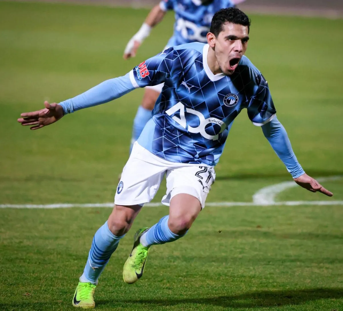 محمد حمدي يحتفل بهدفه القاتل في مرمى طلائع الجيش (نادي بيراميدز)
