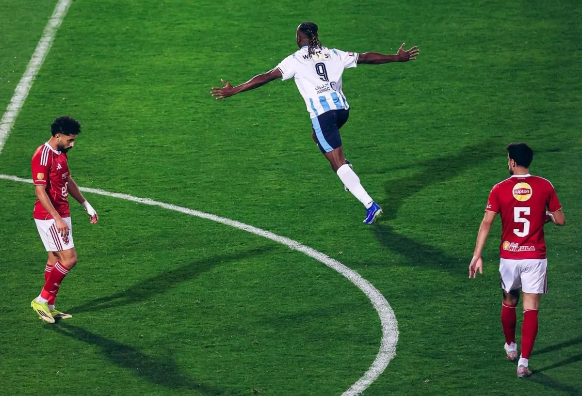 الكونغولي فيستون ماييلي يحتفل بهدفه في مرمى الأهلي (نادي بيراميدز)