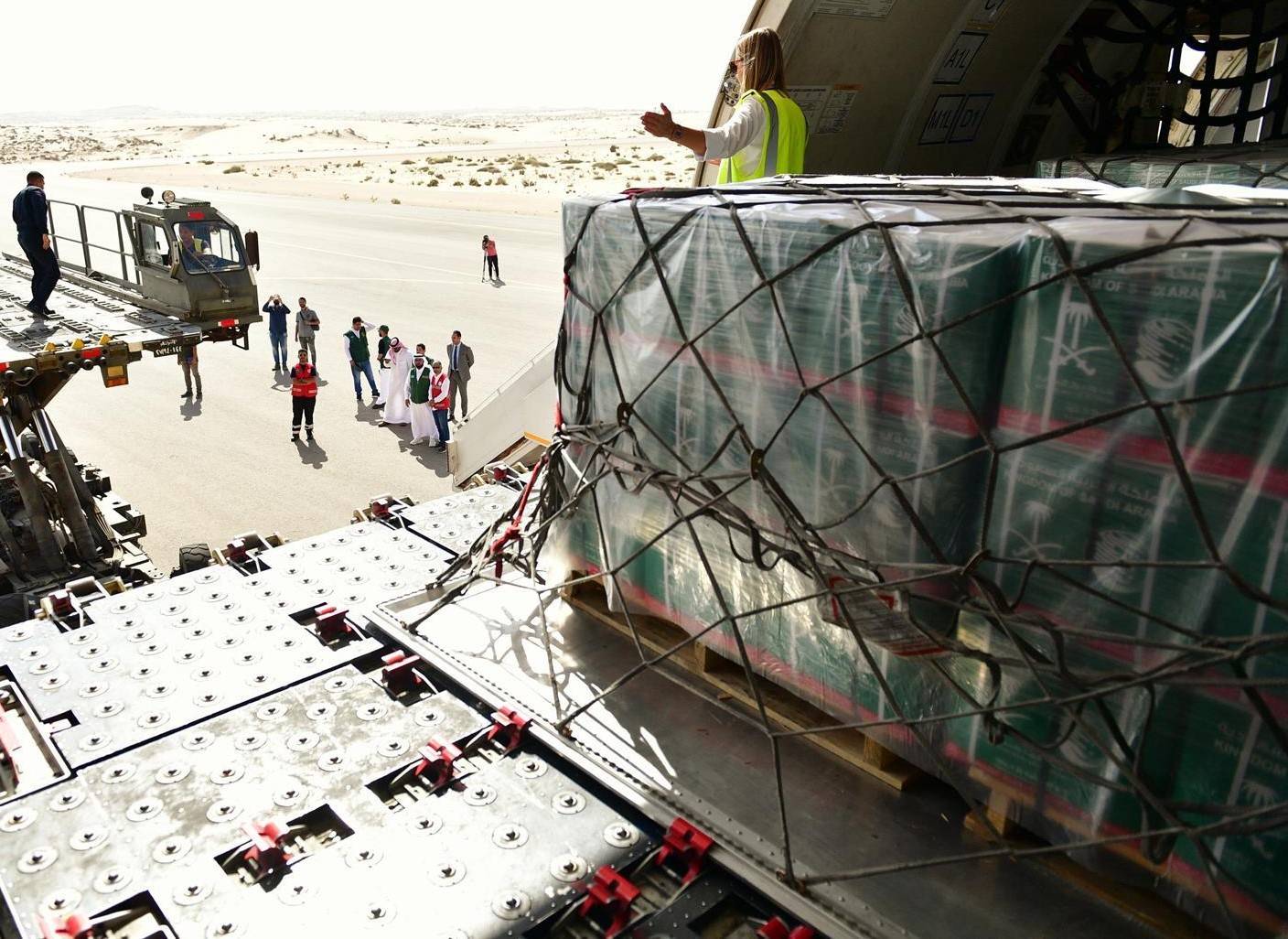 وسير الطائرتين الإغاثيتين السعوديتين، مركز الملك سلمان للإغاثة بالتنسيق مع وزارة الدفاع، تمهيداً لنقل المواد الإغاثية إلى المتضررين داخل قطاع غزة، وتحملان على متنهما سيارتي إسعاف ومواد طبية تزن 32 طناً، وذلك ضمن الحملة الشعبية لإغاثة الشعب الفلسطيني في قطاع غزة.