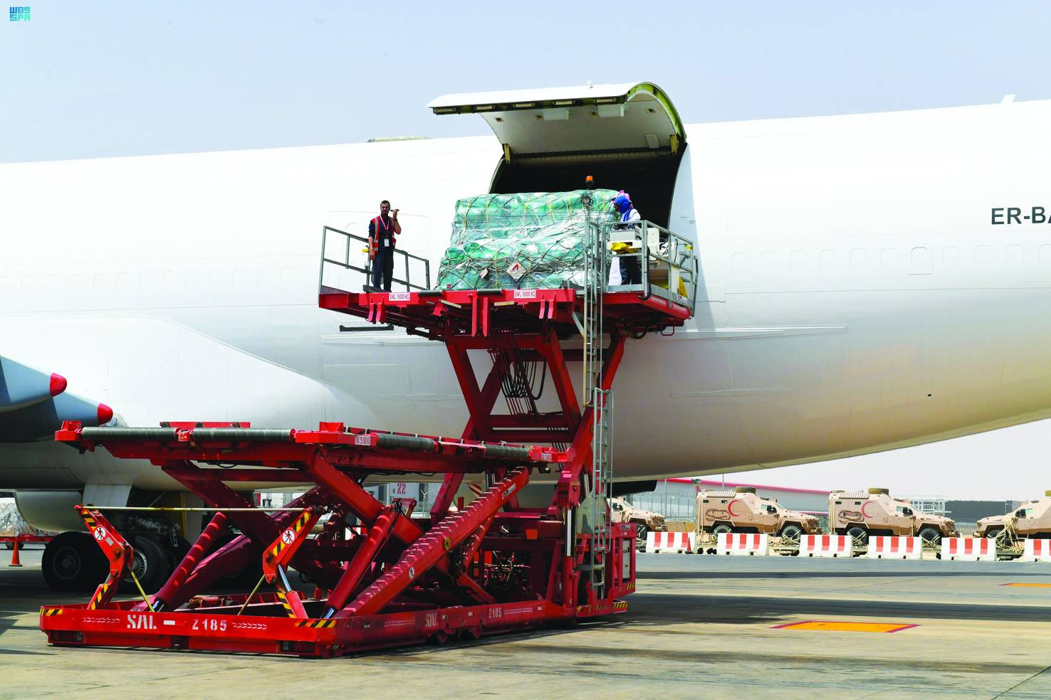 الطائرة الإغاثية السعودية تحمل سيارتي إسعاف (واس)
