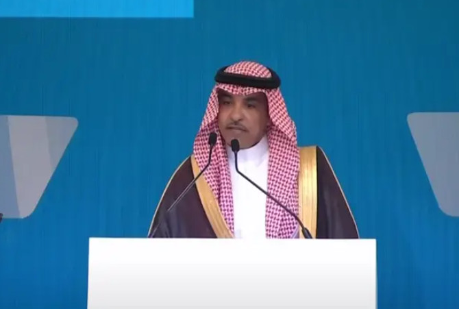 سلمان الدوسري وزير الإعلام السعودي يتحدث خلال المؤتمر الصحافي في الرياض الاثنين (الشرق الأوسط)