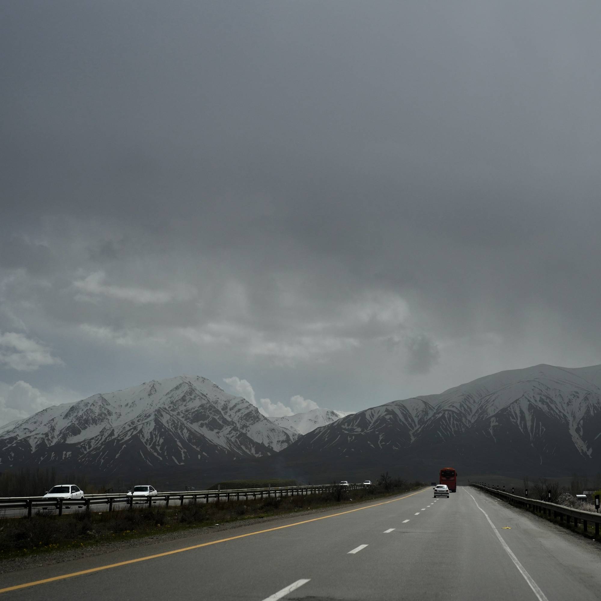 شاحنة محملة بالأخشاب ومركبات أخرى تسير على طريق باتجاه طهران قرب الحدود التركية (أ.ب)
