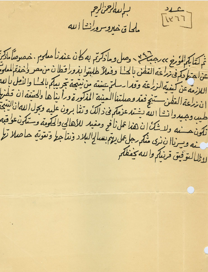 أما الوثيقة الثانية فهي بخصوص تشجيع الملك عبد العزيز لزراعة القطن في بلاده. وأوضح الدكتور العساكر أن هذه الوثيقة تكشف السمات القيادية لدى المؤسس الملك عبد العزيز. الجمع بين الأصالة والمعاصرة، وإيمانه بالأخذ بتحديث بلاده، وإدخال كل ما من شأنه رقي البلاد في جوانبها الحضارية والتطويرية، لافتاً إلى أنه حصل على الوثيقة التي تكشف اهتمام الملك عبد العزيز بتشجيع المواطنين على إدخال الوسائل الحديثة والاقتصادية التي تعود بالنفع على البلاد، مثل زراعة القطن، موضحاً أن هذه الوثيقة زوّده بصورة منها ماهر العجاجي، من محفوظات والده الشيخ محمد بن عبد العزيز العجاجي، مسؤول بيت المال في الأحساء، ومؤرخة في 31 يناير (كانون الثاني) 1928 (22 رجب 1346هـ)، متضمنة رداً من الملك عبد العزيز، موجباً على رسالة الشيخ العجاجي عن نجاح زراعة القطن في الأحساء، بعد استزراعه في المنطقة، وجلب بذوره من مصر، ونقل هذه التجربة إلى البلاد السعودية، وحصول الملك على عينة منها. وقال الملك عبد العزيز في الردّ: «ولا شك أن هذا عمل نافع ومفيد للأهالي والحكومة، وستكون عواقبه حسنة، ويسرنا أن نرى منكم عملاً يهتم بصالح البلاد ونتاجها وتقوية حاصلاتها».
