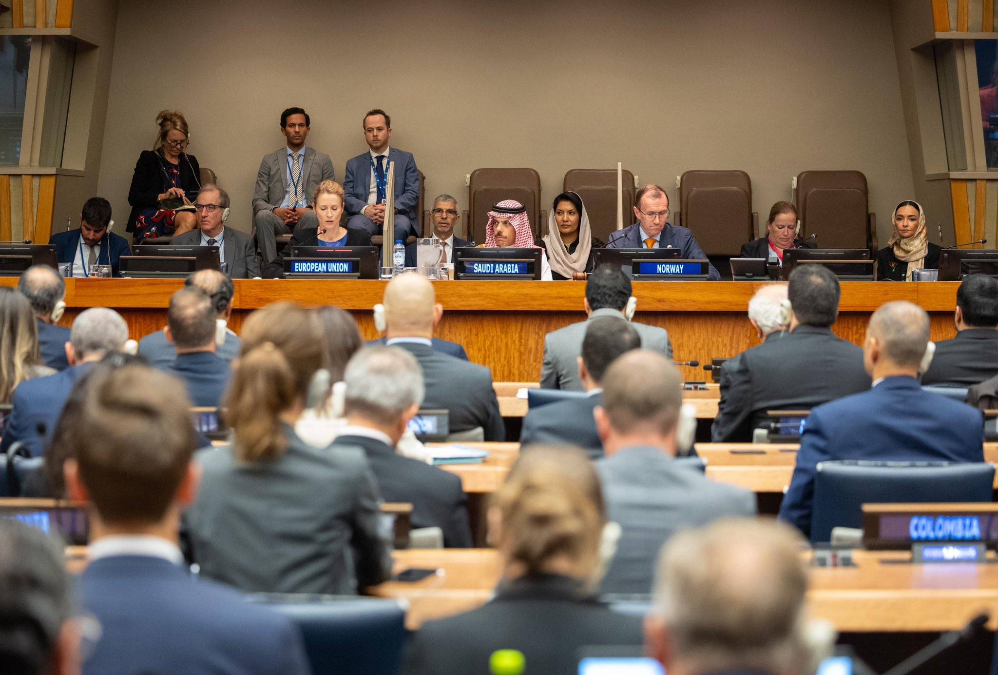 وقال الأمير فيصل بن فرحان إن الاجتماع يأتي بعد عام على إطلاق «تحالف تنفيذ حل الدولتين» برئاسة السعودية، بالشراكة مع الاتحاد الأوروبي والنرويج، وبعد أيام من اعتماد الجمعية العامة «إعلان نيويورك» الذي «يُشكِّل إجماعاً دولياً تاريخياً على إنهاء الاحتلال وتجسيد الدولة الفلسطينية المستقلة».