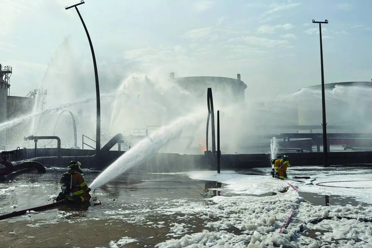 رجال الإطفاء في البحرين يخمدون حريقاً تسببت به هجمات إيرانية (أ.ب)