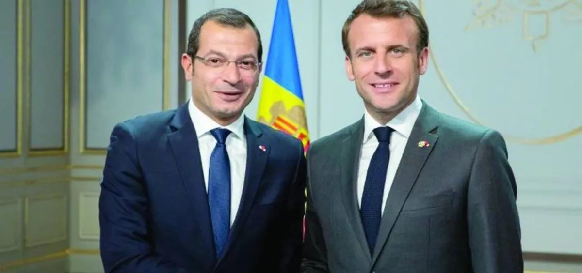 السفير رامي عدوان بعد تقديم أوراق اعتماده للرئيس الفرنسي إيمانويل ماكرون (تويتر)