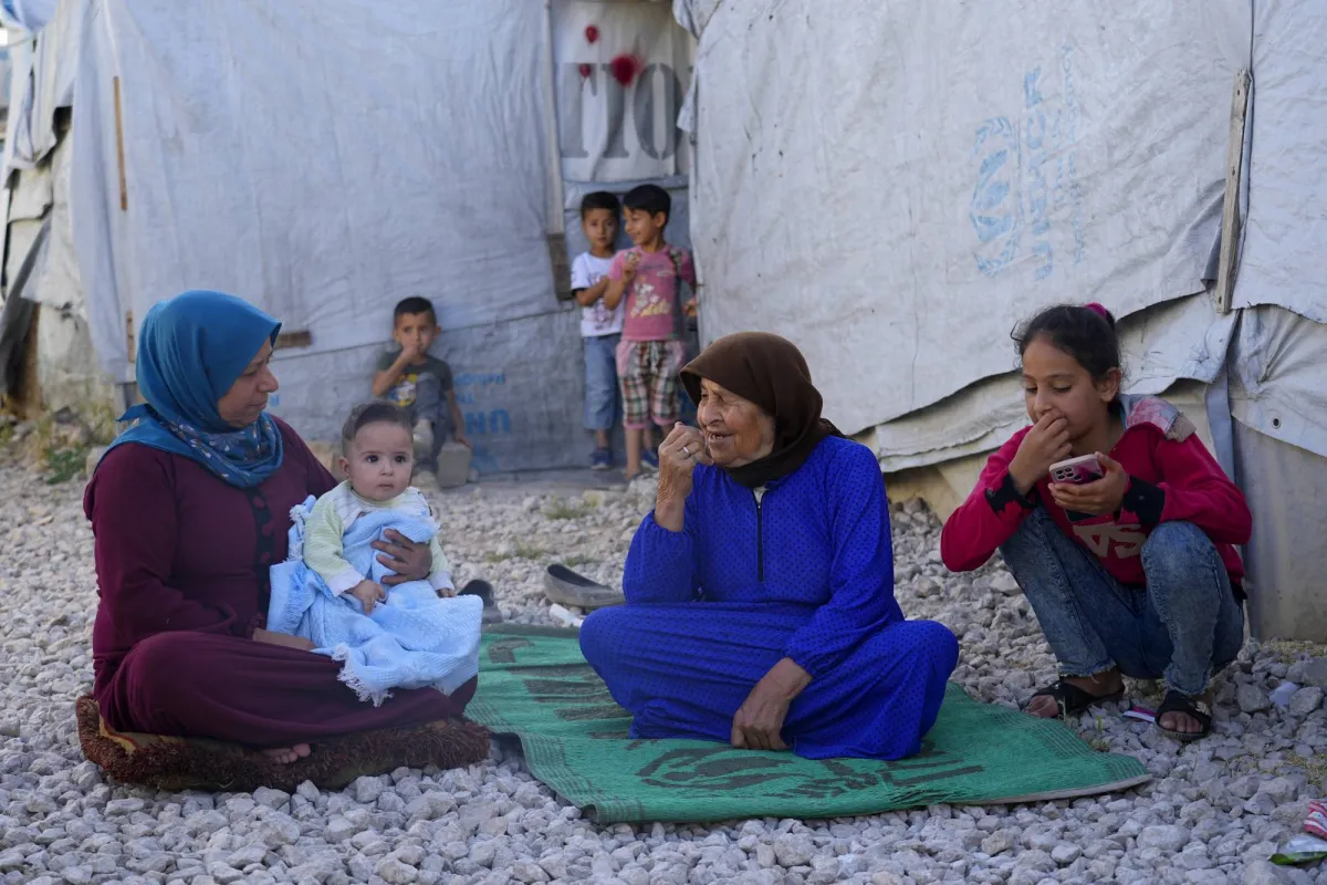عائلة سورية تجلس أمام خيمتها في مخيم للاجئين في بلدة برالياس في سهل البقاع بلبنان (أ.ب)