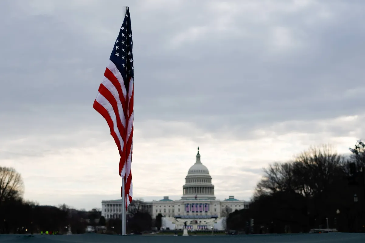 العلم الأميركي ويظهر خلفه مبنى الكابيتول بواشنطن في 18 يناير 2021 (رويترز)