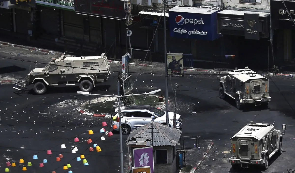 آليات للجيش الإسرائيلي خلال اليوم الثاني من العملية العسكرية في مخيم جنين بالضفة الغربية في 4 يوليو 2023 (إ.ب.أ)