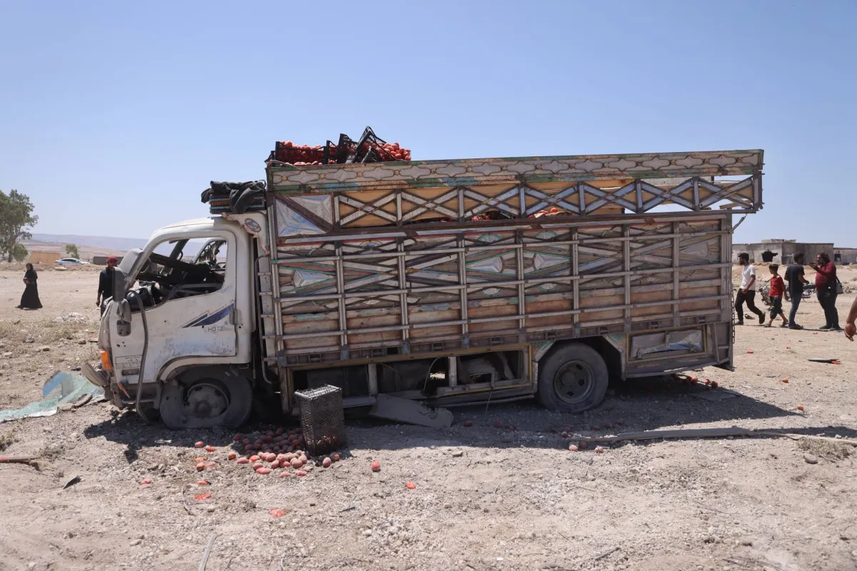 شاحنة متضررة عقب إصابتها في غارة روسية على جسر الشغور في 25 يونيو الماضي (د.ب.أ)