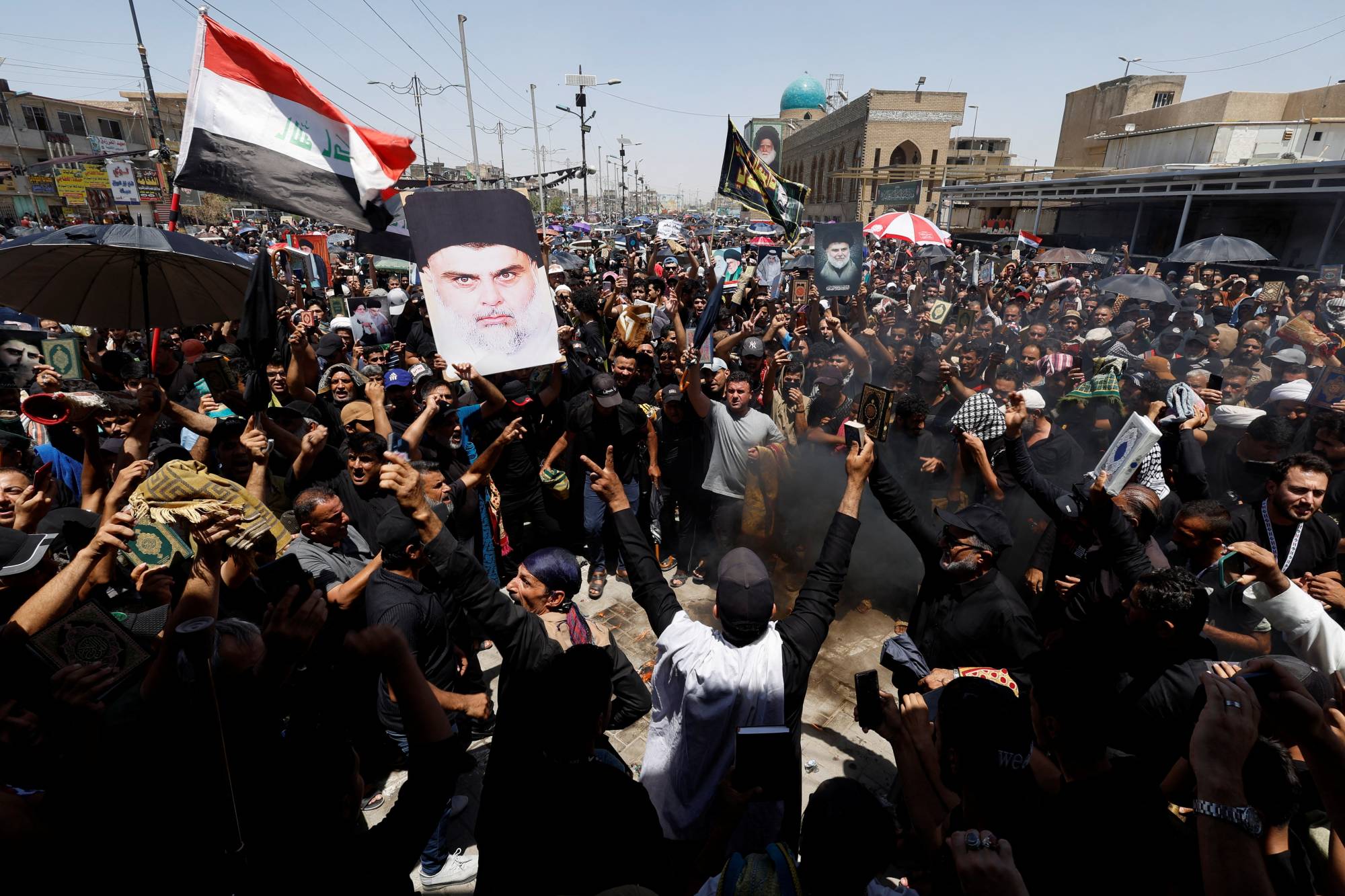 تجددت المظاهرات قبل وبعد صلاة الجمعة في الشارع العراقي، في وقت تقترب فيه درجات الحرارة من نصف درجة الغليان. ففيما تظاهر العشرات من أنصار الفصائل المسلحة العراقية وسط بغداد احتجاجاً على تدنيس القرآن الكريم والعلم العراقي في السويد، تظاهر أنصار زعيم «التيار الصدري» بعد صلاة الجمعة في بغداد. وهتفوا: «نعم نعم للإسلام، نعم نعم للقرآن». كما رفعوا نسخاً من المصحف وصوراً لمقتدى الصدر.