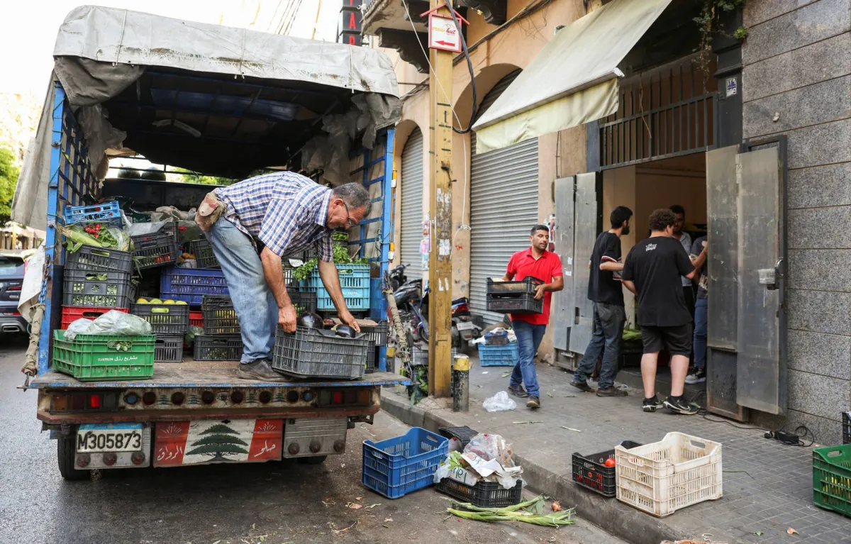 رجل يفرغ حمولة الخضار والفواكه من شاحنة في حي ببيروت (رويترز)