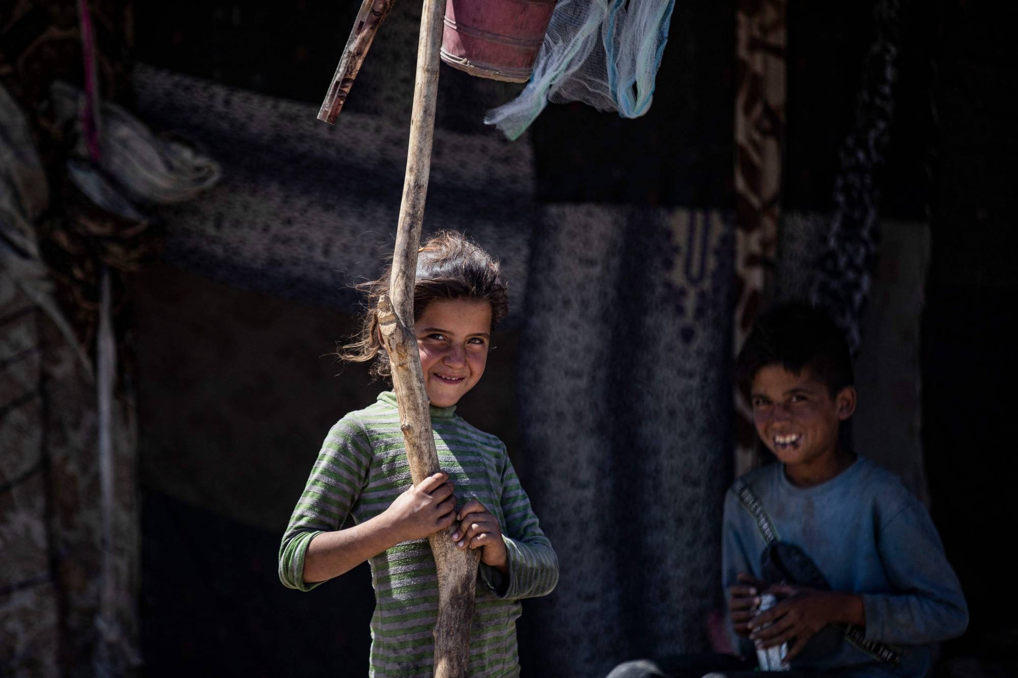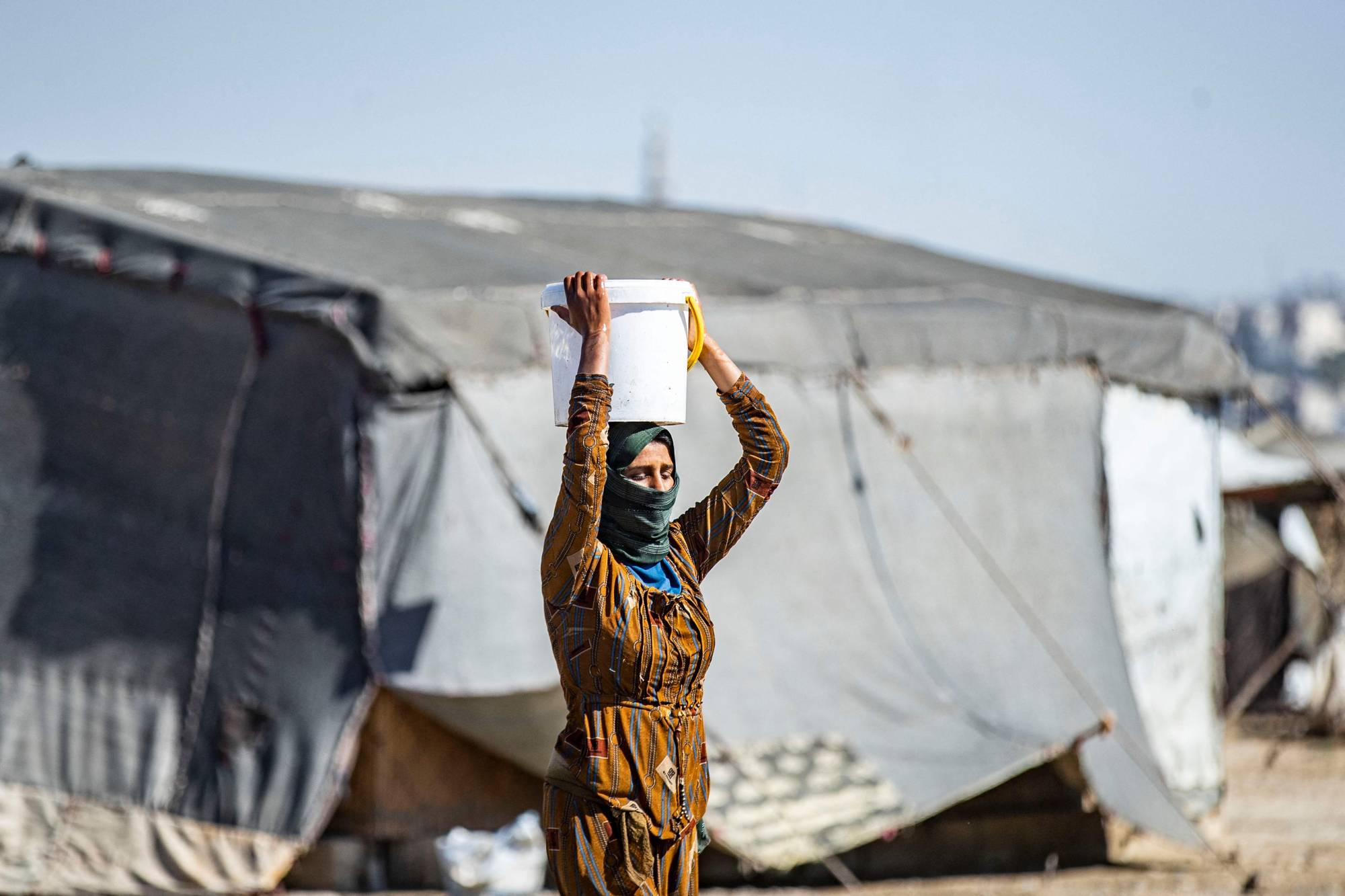في المخيم اليوناني حيث تعيش والذي اكتسب اسمه من مطعم يحمل الاسم ذاته على ضفاف نهر الفرات عند أطراف مدينة الرقة، تتعالى أصوات أطفال يركضون بين خيم مهترئة تحت أشعة شمس حارقة. وتنقل نساء المياه في أوعية يملأنها من صنبور في باحة المخيم، فيما تنهمك طفلة بغسل الأطباق قرب خزان مياه.